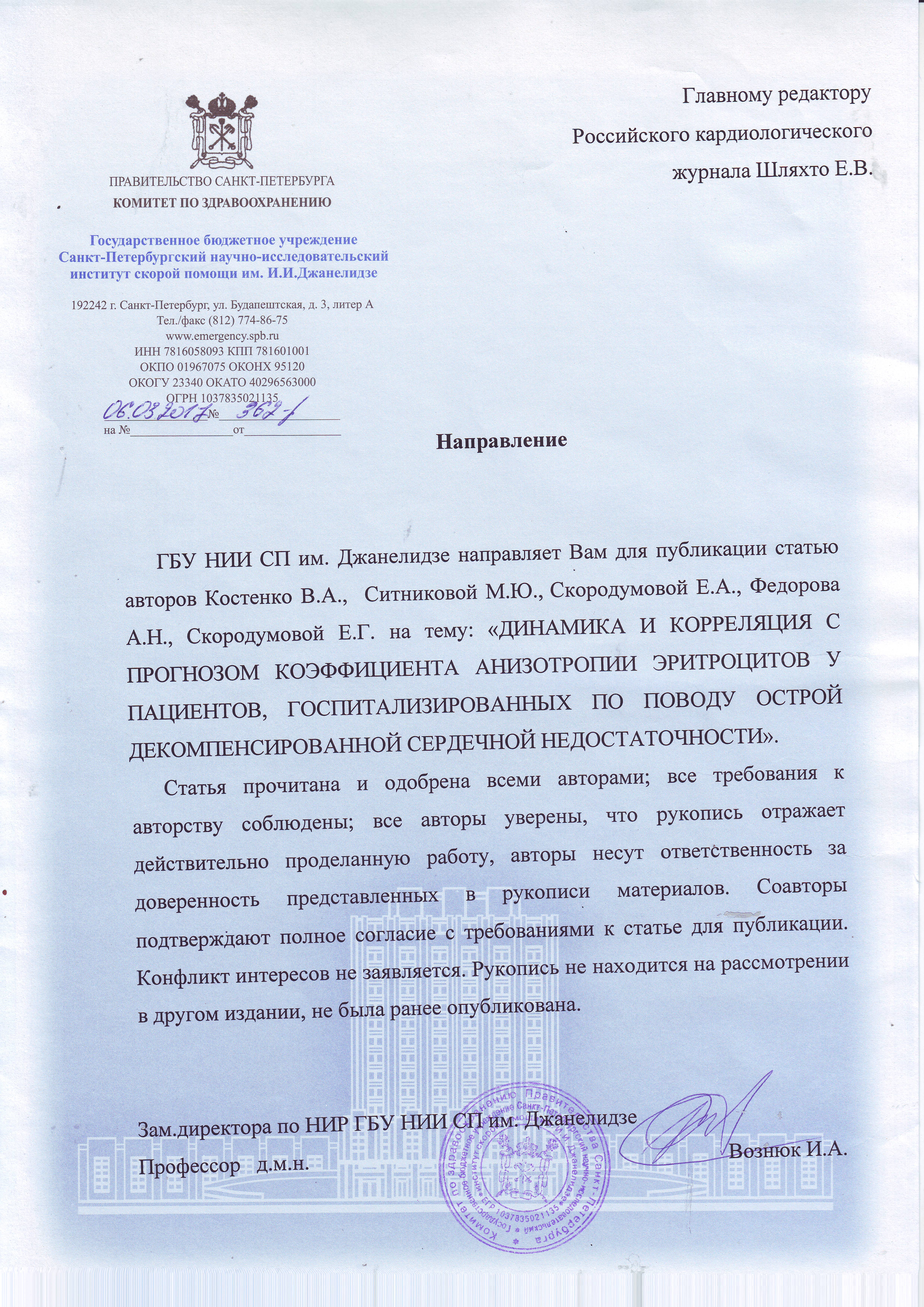 Kostenko V.A., Sitnikova M.Yu., Skorodumova Е.A., Skorodumova Е.G., Fedorov A.N. PREDICTIVE VALUE OF ERYTHROCYTE ANISOTROPY COEFFICIENT IN PATIENTS HOSPITALIZED FOR ACUTELY DECOMPENSATED CHRONIC HEART FAILURE. Russian Journal of Cardiology. 2017;(12):26-30. (In Russ.) https://doi.org/10.15829/1560-4071-2017-12-26-30