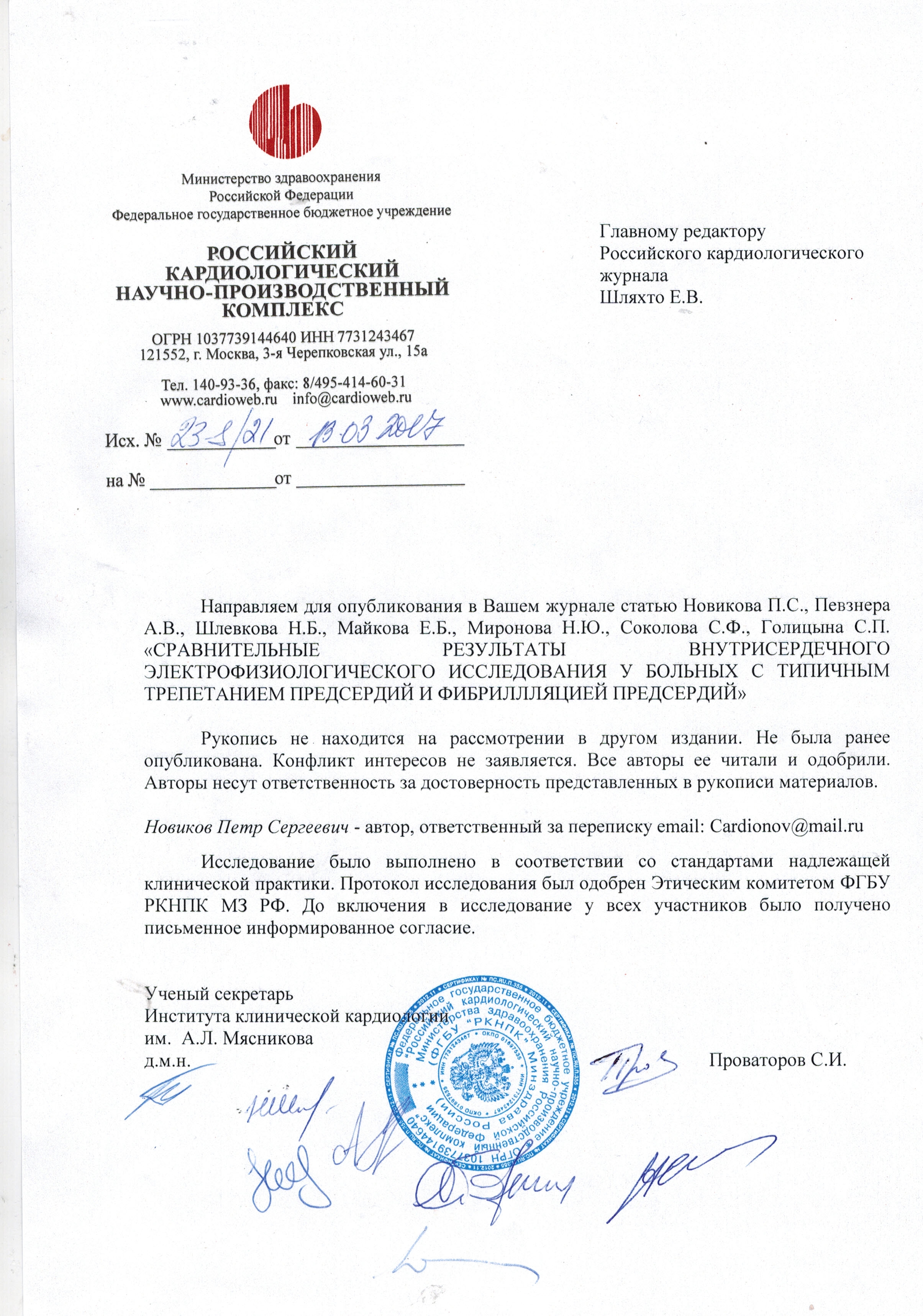 Новиков П.С., Певзнер А.В., Шлевков Н.Б., Майков Е.Б., Миронов Н.Ю., Соколов С.Ф., Голицын С.П. СРАВНИТЕЛЬНЫЕ РЕЗУЛЬТАТЫ ВНУТРИСЕРДЕЧНОГО ЭЛЕКТРОФИЗИОЛОГИЧЕСКОГО ИССЛЕДОВАНИЯ У БОЛЬНЫХ С ТИПИЧНЫМ ТРЕПЕТАНИЕМ ПРЕДСЕРДИЙ И ФИБРИЛЛЯЦИЕЙ ПРЕДСЕРДИЙ. Российский кардиологический журнал. 2017;(7):125-131. https://doi.org/10.15829/1560-4071-2017-7-125-131