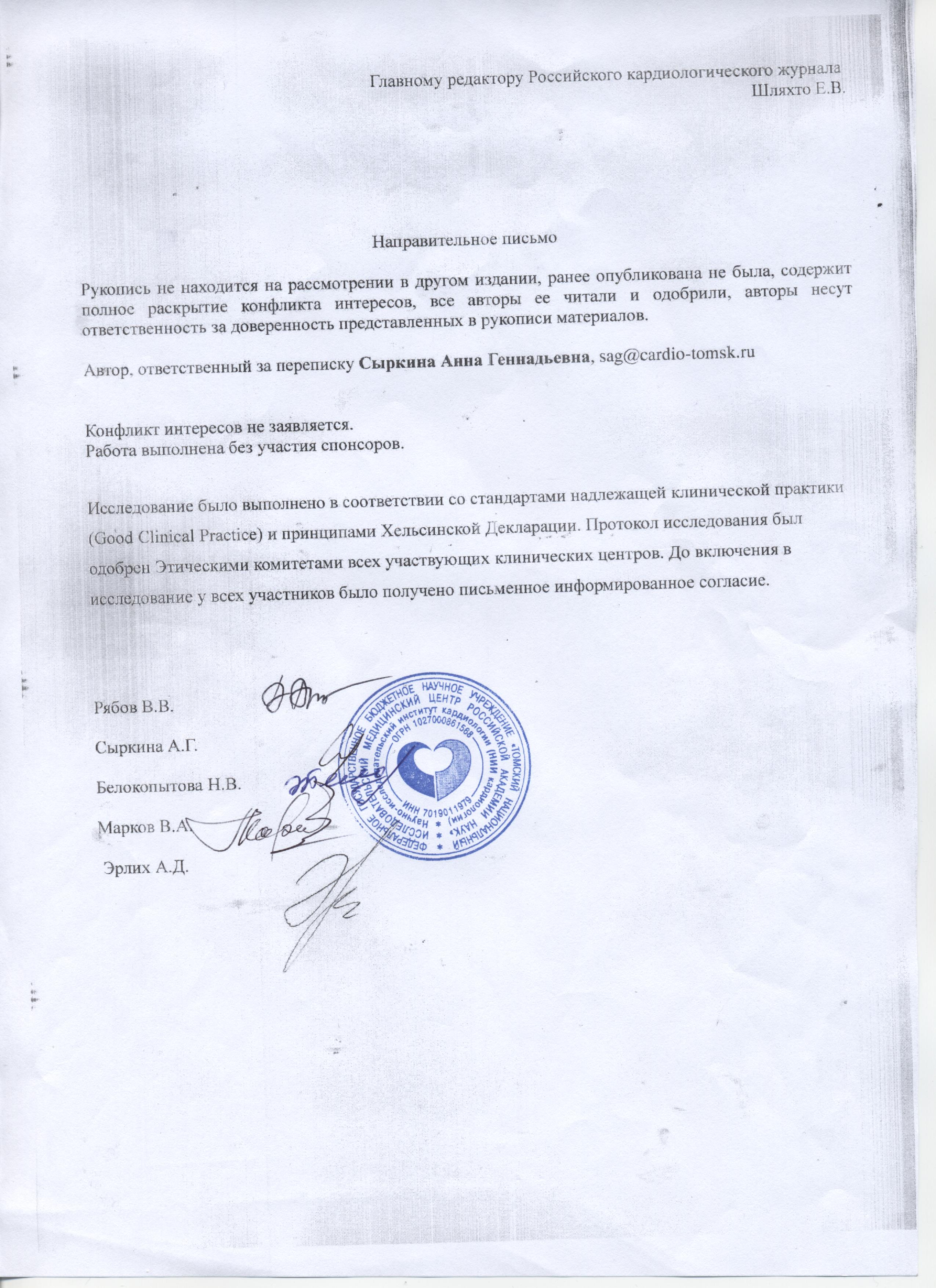 Марков В.А. — доктор медицинских наук, профессор, ведущий научный сотрудник отделения неотложной кардиологии, зав. кафедрой кардиологии ФПК и ППС