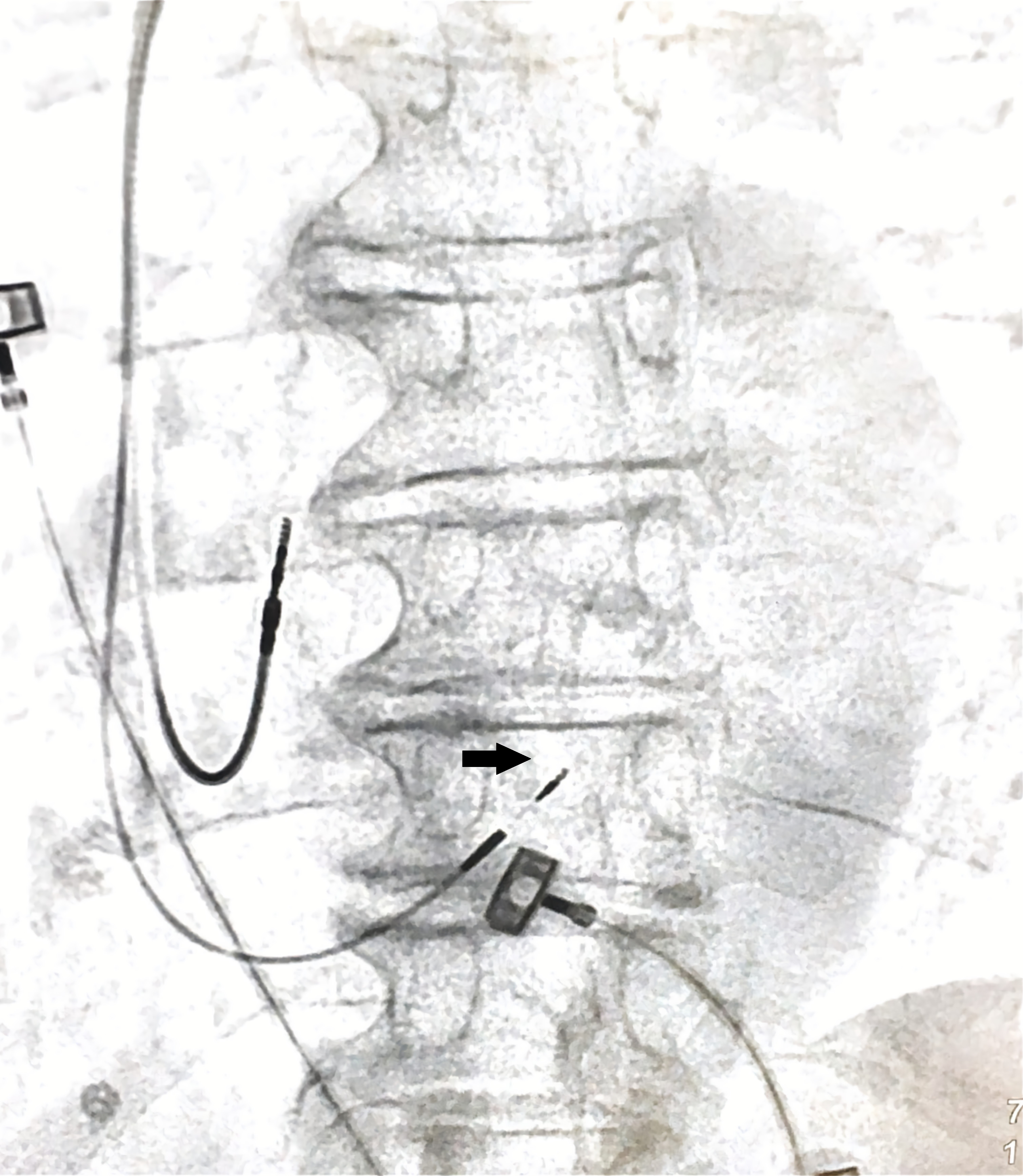Рис. 1. Рентгенанатомическая проекция электрода в гисиальной позиции. Примечание: черная стрелка указывает на фиксирующую спираль электрода.