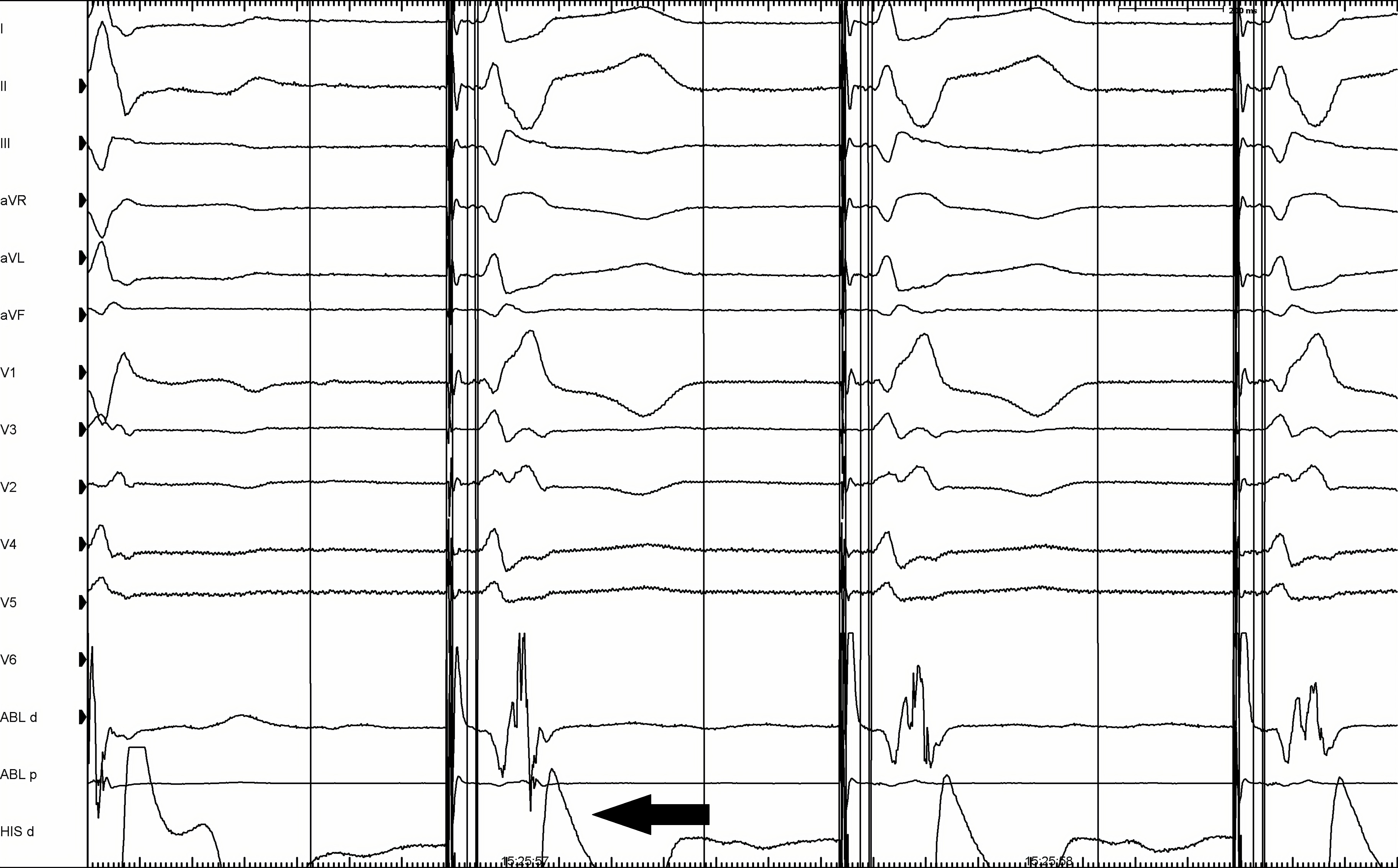 Примечание: пример достигнутой С-СПГ с интраоперационно развившейся блокадой правой ножки пучка Гиса. Черная стрелка указывает на дискретный желудочковый сигнал, полученный с электрода в гисиальной позиции. Скорость записи 100 мм/сек.