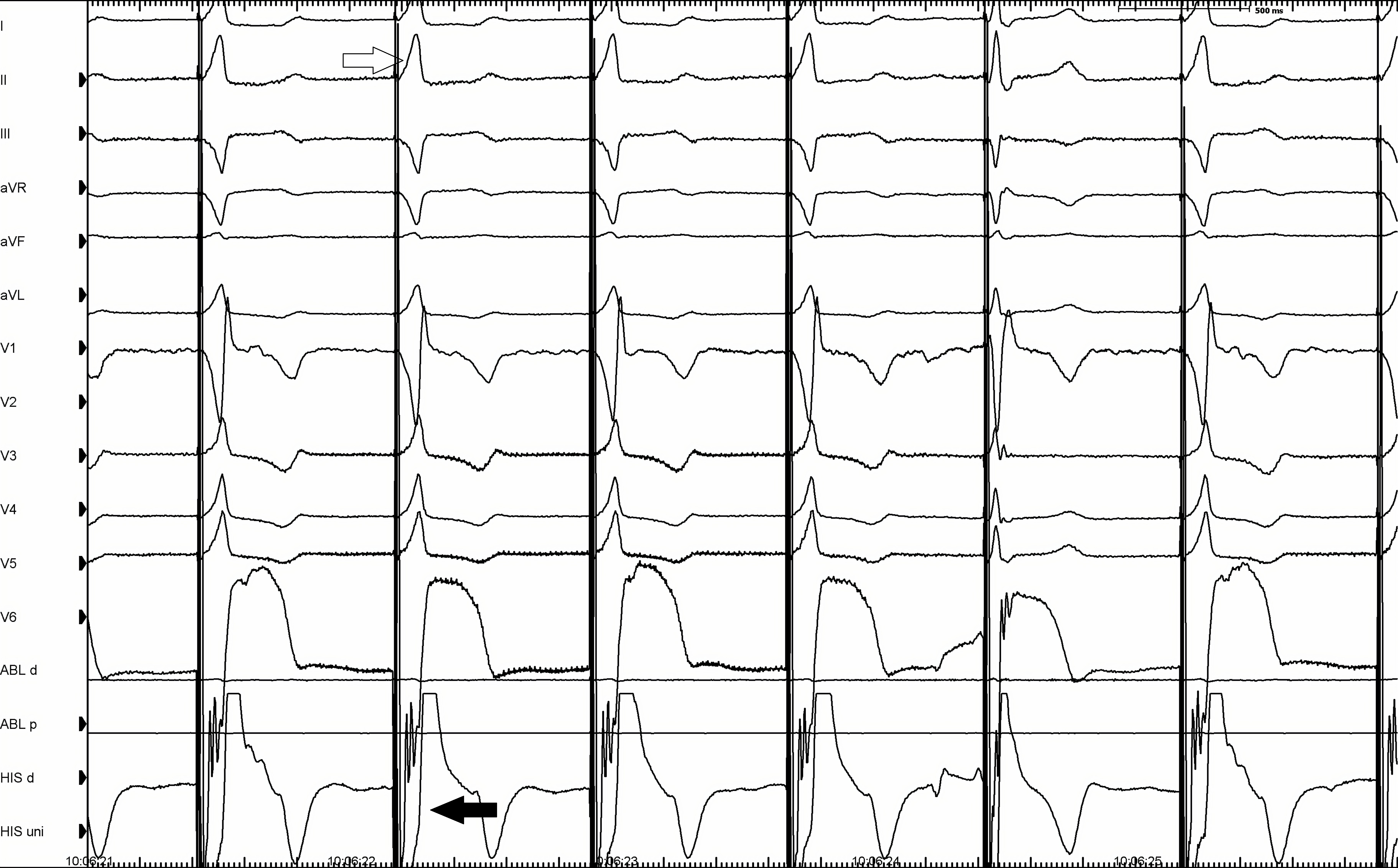 Примечание: белая стрелка указывает на псевдо-дельта волну, возникающую в результате стимуляции прилежащей к ПГ ткани ПЖ. Черная стрелка указывает на локальную желудочковую ЭГ, слитую со спайком стимуляции. Скорость записи 50 мм/сек.