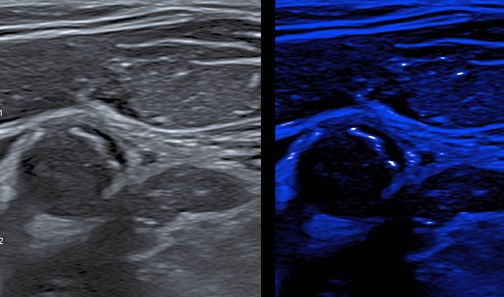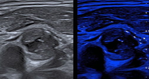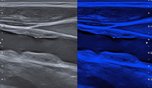 Рис. 5. Ультразвуковое изображение АСБ с множественными МК в покрышке в режиме MicroPure.