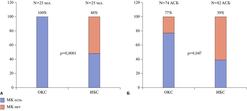 Рис. 2. Наличие МК в АСБ СА (MicroPure) у пациентов с ОКС по сравнению со стабильной ИБС. А) частота МК у пациентов ОКС и ИБС, Б) частота МК в АСБ СА у пациентов ОКС и ИБС.