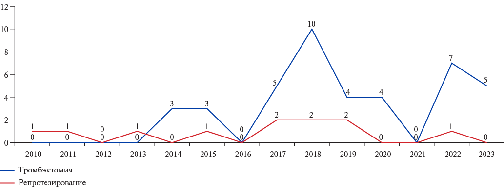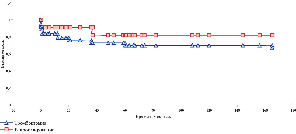 - Результаты тромбэктомии сопоставимы с результатами репротезирования.