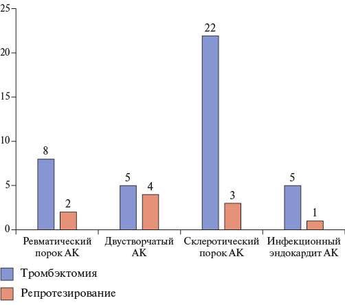 Результаты тромбэктомии протеза АК в раннем и позднем периоде сопоставимы с результатами репротезирования АК. Тромбэктомия представляет собой более быстрый и простой хирургический метод восстановления функции искусственного клапана сердца, по сравнению с его репротезированием. Исходя из нашего опыта, тромбэктомию можно рассматривать как операцию, альтернативную репротезированию для пациентов с высоким хирургическим риском. Выбор тактики хирургического вмешательства должен основываться на интраоперационной оценке состояния клапана.