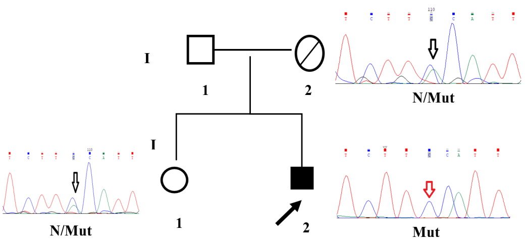 Примечание: здоровые члены семьи обозначены незакрашенными фигурами, пробанд с диагнозом обозначен сплошным заполнением. Через N обозначена референсная последовательность, Mut — замена NAA10 NM_003491.4: c.128A>C (p.Tyr43Ser). Через косую черту обозначено гетерозиготное состояние, пробанд — гемизиготное состояние.