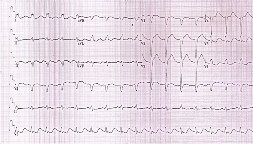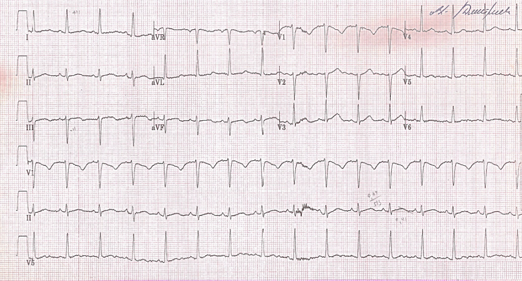 На ЭКГ покоя — резкое отклонение электрической оси сердца (ЭОС) влево (угол α=-30), синусовый ритм, ЧСС 94 уд./мин. PQ — 140 мсек. QRS — 90 мсек, QT — 410 мсек, QTc — 522 мсек, умеренная тахикардия, блокада передней ветви левой ножки, удли-