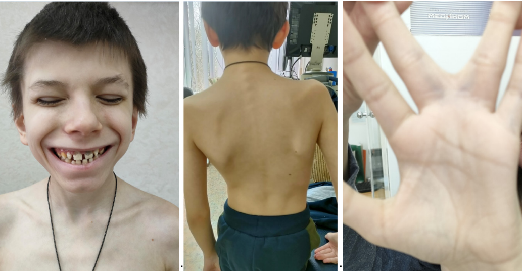 Примечание: множественные стигмы дисэмбриогенеза (микроцефалия, низко посаженные уши, широкая и плоская переносица, гипертелоризм, широкие передние зубы, с большими промежутками, неполная синдактилия 3 и 4 пальцев; сколиоз). Фотографии демонстрируются с разрешения отца.