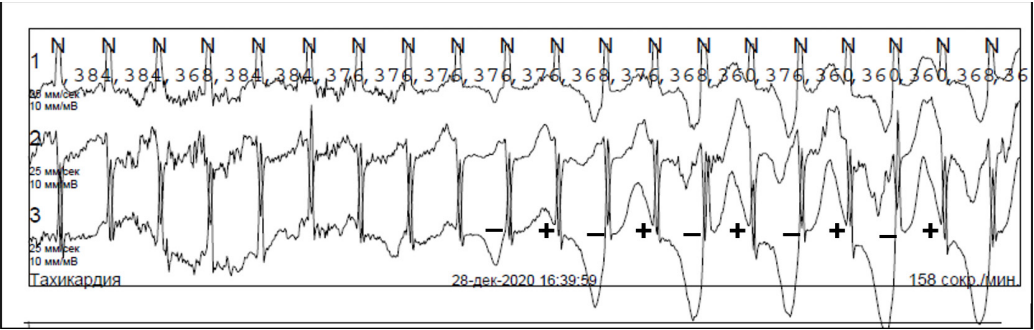 При холтеровском мониторировании — синусовый ритм, умеренная тахикардия, редкие (<1%) одиночные и парные мономорфные желудочковые экстрасистолы, удлинение интервала QT (QT на минимальной ЧСС 49 уд./мин — 592 мсек, среднесуточный интервал QTс — 524 мсек). Зарегистрированы эпизоды альтернации зубца Т (изменение полярности Т волны в следующих друг за другом сокращениях) — грозный предвестник опасных желудочковых аритмий (рис. 3). По результатам эхокардиографии размеры сердца и сократительная способность в норме.