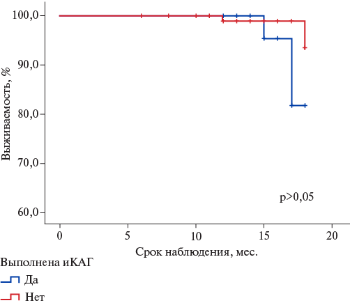 Пациенты, которым было показано выполнение иКАГ, имели более высокие значения ИКК по сравнению с пациентами, которым иКАГ не выполнялась: Ме 268,0, Q1-Q3: 78,5-714,0 vs Ме 163,5, Q1-Q3: 18,0-404,0, р=0,02 (табл. 2), по остальным параметрам группы не различались.