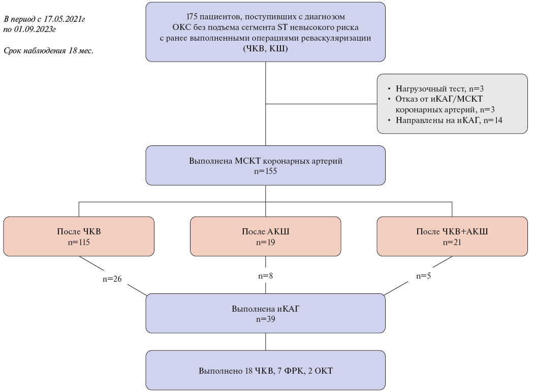 Критерии включения в исследованиевозраст старше 18 лет, ОКСбпST низкого и промежуточного рисков, наличие в анамнезе ЧКВ и/или КШ, подписанное информированное согласие. Критерии исключения: пациенты с ОКСбпST высокого риска, пациенты с противопоказаниями к проведению МСКТ КА (аллергические реакции на йодсодержащие контрастные вещества, тяжелая почечная и печеночная недостаточность, любые нарушения ритма сердца, проявляющиеся тахикардией).