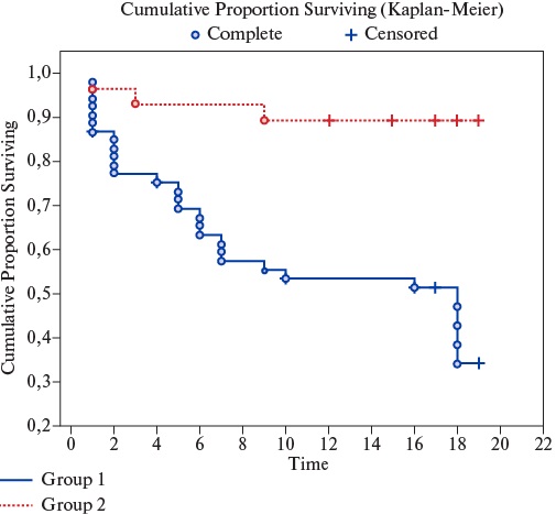 Примечание: при сравнении кривых Каплана-Мейера по критерию Гехана р=0,044.