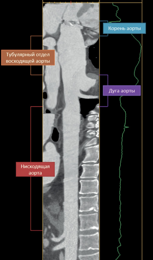 Длину аорты измеряли перпендикулярно центральной линии просвета сосуда в следующих сегментах: (i) от уровня фиброзного кольца аортального клапана до сино-тубулярного соединения (корень аорты); (ii) от сино-тубулярного соединения до уровня БЦС (тубулярная часть восходящей аорты); (iii) от БЦС до истмуса аорты (дуга аорты); (iv) от истмуса аорты до устья чревного ствола (нисходящая аорта) (рис. 1).