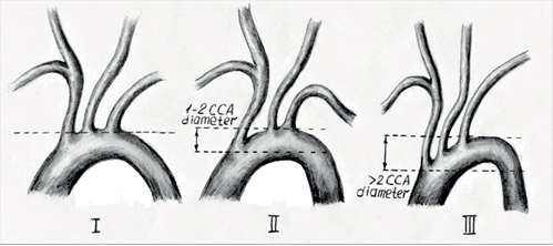 Кроме этого, на основании данных МСКТ-аортографии определяли тип дуги аорты, ориентируясь на расстояние по вертикали от начала БЦС до вершины дуги аорты [6]. Так, к I типу относили дугу аорты, при которой расстояние по вертикали между устьем БЦС и вершиной дуги аорты составляло <1 диаметра лОСА. Ко II типу дуги аорты относили такую дугу, при которой расстояние по вертикали между БЦС и вершиной дуги составляло 1-2 диаметра лОСА. К III типу дуги аорты относили дугу, при которой расстояние по вертикали между БЦС и вершиной дуги аорты было >2 диаметров лОСА (рис. 2).
