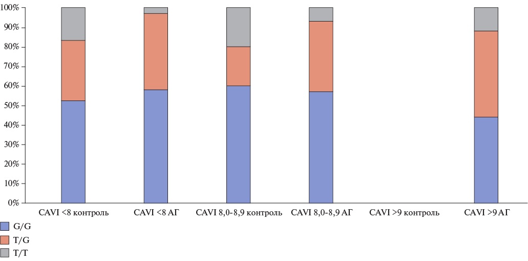 В основной группе, характеризующейся значениями CAVI в диапазоне от 8,0 до 8,9, аллель T/G обнаруживалась чаще, чем в контрольной группе. В подгруппе с более высокими значениями CAVI (>9) частота встречаемости полиморфизмов T/G и Т/Т была выше, чем полиморфизма G/G (рис. 5).
