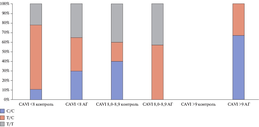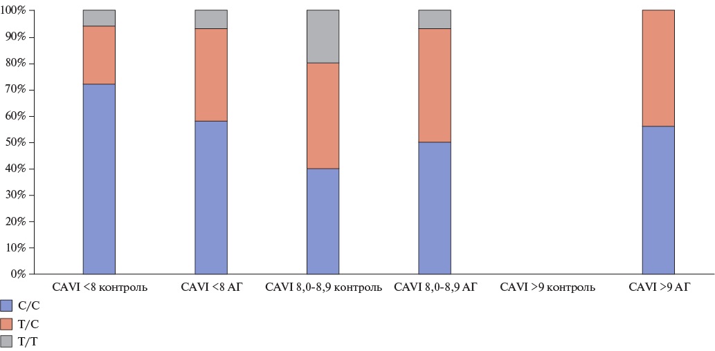 Однако в подгруппе без АГ и с показателем CAVI от 8,0 до 8,9 был обнаружен более высокий процент носителей генотипа Т/Т.