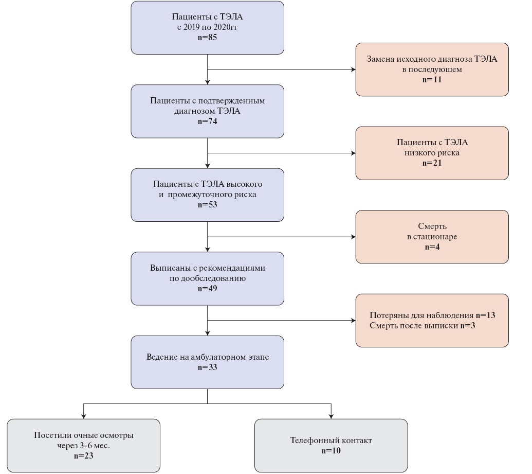 После завершения стационарного лечения 49 пациентов были выписаны с рекомендациями по дообследованию и обращению на амбулаторный прием через 3-6 мес. после эпизода ТЭЛА. Из всех пациентов 32,7% оказались потеряны для дальнейшего наблюдения в ФГБУ "НМИЦ им. В. А. Алмазова" после выписки из стационара. Из 33 пациентов, данные которых оказались доступны, очные амбулаторные приемы посетили 23 (69,7%) пациента. Еще 10 (30,3%) пациентов были опрошены при телефонном контакте, выполненном на момент проведения настоящего исследования.