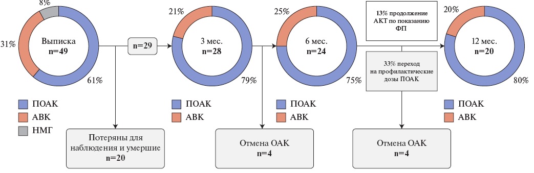 В качестве антикоагулянтных препаратов при выписке 30 (61,2%) пациентам назначались прямые оральные антикоагулянты (ПОАК). 15 больным (30,5%) был рекомендован прием антагонистов витамина К (АВК), в связи с выявлением наследственной тромбофилии, рецидивирующим течением ВТЭО, наличием тромбоза левого предсердия и подозрением на ХТЭЛГ (рис. 2). 4 пациентам (8,2%) при выписке в качестве антикоагулянтной терапии был назначен низкомолекулярный гепарин в дозе, рассчитанной на массу тела. Среди них были 2 пациентки с ТЭЛА на фоне текущей беременности и 2 пациента с активным ЗНО. Данные о длительности антикоагулянтной терапии с учетом умерших и потерянных для наблюдения пациентов оказались доступными у 29 больных. Медиана времени приема антикоагулянтов составила 22 [ 7,5; 31,5] мес. Помимо легочной эмболии 13% пациентов уже на этапе стационара имели иные показания для продолжения антикоагулянтной терапии. В течение 3 мес. антикоагулянтную терапию получали 28 (96,6%) пациентов, 6 мес. — 24 (82,8%) пациента, ≥12 мес. — 20 (69,0%) пациентов. Таким образом, только у 31% (n=9) пациентов антикоагулянтная терапия была полностью отменена. Во всех случаях отмена антикоагулянтной терапии проводилась после обследования и с разрешения врача. Смена антикоагулянтного препарата проводилась у 21% (n=6) пациентов. При этом в 4 случаях имел место переход с АВК на ПОАК, в 1 случае с низкомолекулярного гепарина на ПОАК и в 1 случае с ПОАК на АВК в связи с развитием у пациента ХТЭЛГ. Среди пациентов, получающих ПОАК (82,8%, n=24), у 31% пациентов была произведена замена лечебных доз на профилактические через 6 мес. от момента выписки. 4 пациента (13,8%) в рамках пролонгированной антикоагулянтной терапии получали АВК с коррекцией дозы по международному нормализованному отношению.