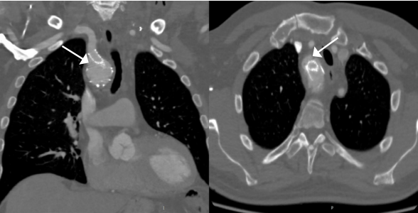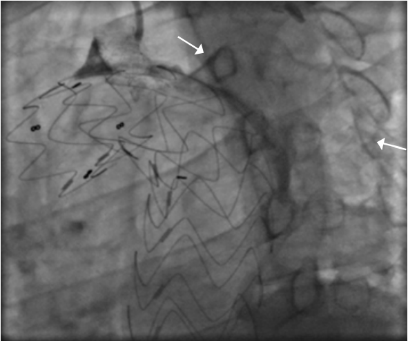 Рис. 5. Эндолик 1C типа из правой подключичной артерии (стрелки) после стентирования грудной аорты.