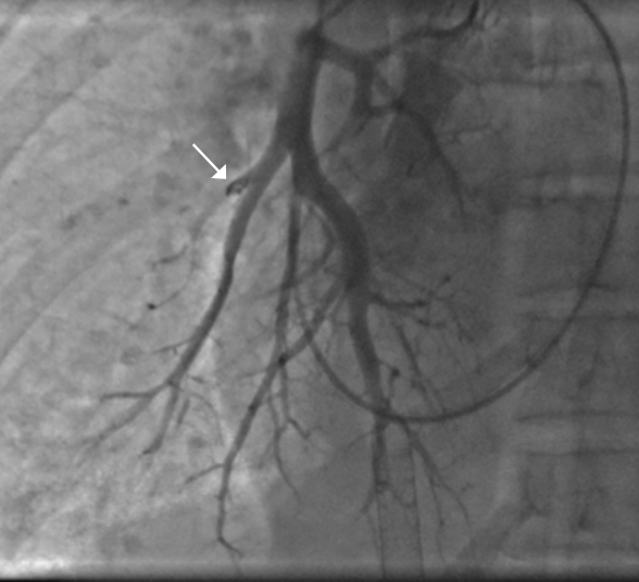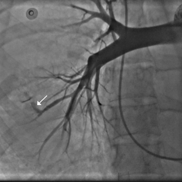 Рис. 8. Источник кровотечения из субсегментарной ветви правой нижнедолевой легочной артерии (стрелка).
