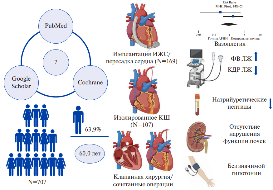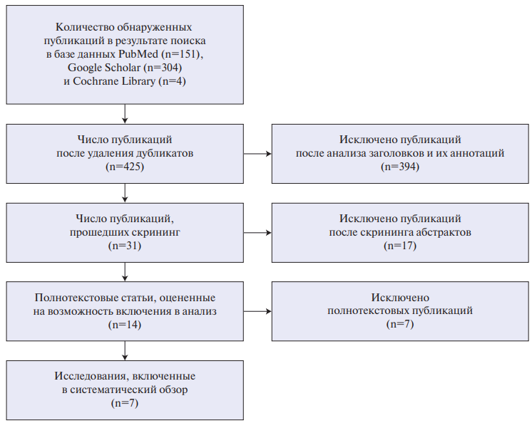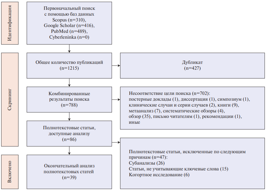 В обзор включались только рецензируемые статьи, метаанализы, систематические обзоры, клинические руководства, результаты многоцентровых рандомизированных исследований и регистров, имеющие клиническую значимость и методологическую обоснованность. Исключались единичные клинические случаи, дублирующие публикации, статьи без описания методики, а также устаревшие данные, утратившие актуальность.