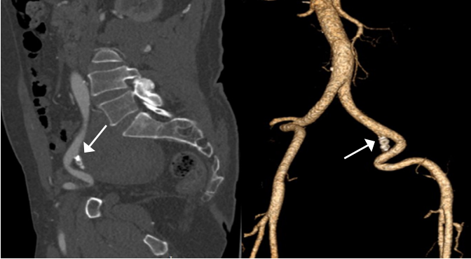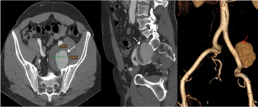 Изолированные аневризмы внутренней подвздошной артерии (ВПА) (гипогастральной артерии) являются редкой формой аорто-подвздошной аневризматической патологии и встречаются примерно в 0,04% всех аорто-подвздошных аневризм. Благодаря глубокому расположению в малом тазу эти аневризмы часто диагностируются на поздних стадиях и достигают значительных размеров (рис. 2). Риск разрыва таких аневризм высок и достигает до 38% при первичной постановке диагноза, при этом смертность от разрыва достигает 58%, что подчёркивает необходимость своевременного выявления и лечения данной патологии. Ввиду отсутствия проспективных рандомизированных исследованиях, сравнивающих эффективность и безопасность открытой хирургии против эндоваскулярного исключения аневризмы, однозначно ответить на вопрос какая из стратегий предпочтительнее невозможно. Так, в ретроспективном исследовании Choi E, et al. сравнили исходы у 58 пациентов с изолированными аневризмами подвздошной артерии (25 — открытая хирургия, 33 — эндоваскулярная хирургия) [20]. В группе эндоваскулярной хирургии чаще встречались поздние осложнения (15,2% vs 0%, p=0,04) и повторные вмешательства (9,1% vs 4,0%, p=0,44), при этом смертность и частота MACE не различались между группами. Авторы приходят к выводу, что у пациентов с низким операционным риском и более молодым возрастом (66,0±8,2 года vs 73,1±8,6 лет, p=0,003) открытая хирургия предпочтительнее. С целью улучшения результатов эндоваскулярного лечения аневризм подвздошных артерий были предложены комбинированные методы, когда в дополнение к эндоваскулярному закрытию ВПА эндоваскулярными спиралями, выполняется имплантация стент-графта с перекрытием устья ВПА. Так, в исследовании Yang M, et al. были включены 42 пациента (средний возраст 71 год) с изолированными аневризмами ВПА, из которых 12 случаев были разорвавшимися [21]. Применялись различные методы: открытая резекция (n=6), эмболизация (n=12), стент-графт (n=8) и их комбинация (n=16), при этом наименьшие показатели эндоликов (6%) и повторных вмешательств (6%) отмечены при комбинированном подходе. Общая 30-дневная смертность составила 5%, но достигала 17% у пациентов с разрывом, а наиболее частым осложнением у выживших стала перемежающаяся боль в ягодице (18%). Тем не менее эндоваскулярная эмболизация изолированной аневризмы подвздошной артерии спиралями на сегодняшний день представляет собой жизнеспособный вариант лечения и может быть успешно реализована в условиях опытных специализированных центров (рис. 3, 4).