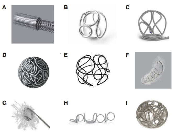 Рис. 1. Различные типы и модификации эмболизационных спиралей. А. Спираль из нержавеющей стали. B. Платиновая спираль Optima (Balt). C. Платиновая спираль Axium Prime (Medtronic). D. Платиновая спираль Packing coil (Penumbra, Inc.). E. Спираль Nexus с нитиноловой сердцевиной (Micro Therapeutics, Inc.). F. Платиновая спираль с нейлоновыми волокнами Nester (Cook Medical). G. Спираль с синтетическими волокнами MReye Flipper (Cook Medical). H. Спираль с гидрогелевым покрытием Azur CX HydroCoil (Terumo). I. Спираль с гидрогелевым покрытием HydroFrame (MicroVention, Inc.).