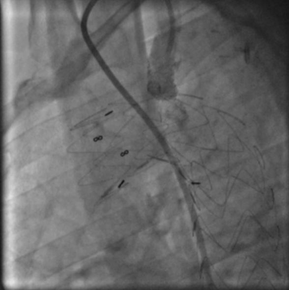 С развитием методов эндопротезирования грудной аорты все чаще применяется техника in-situ фенестрации подключичной артерии, позволяющая сохранить её проходимость при необходимости расширения проксимальной зоны фиксации стент-графта. Такая стратегия обеспечивает адекватное закрытие аневризмы при сохранении кровотока по важным артериальным ветвям. Однако данная техника сопряжена с риском возникновения эндолика типа 1C — краевой утечки крови через устье ветви, что может быть обнаружено как на мультиспиральной компьютерной томографии, так и на аортографии (рис. 5, 6). В случае с подключичной артерией, именно она может стать источником ретроградного кровотока в исключённый аневризматический мешок, что сохраняет давление внутри аневризмы и угрожает её дальнейшему прогрессированию. С расширением метода стентирования грудной при лечении сложной патологии дуги аорты всё более актуальным становится развитие эффективных методов устранения технических и процедурных неудач с целью повышения безопасности и улучшения результатов лечения (рис. 7). Ряд авторов демонстрируют успешное применение эндоваскулярных спиралей при таких сценариях [34][35].