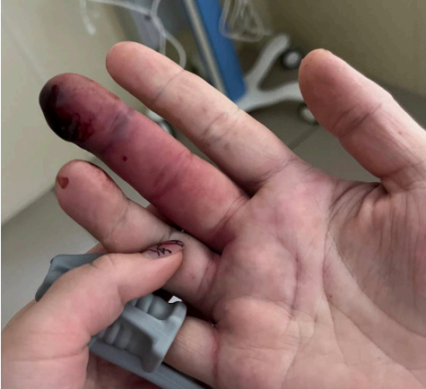 На момент осмотра в приемном покое состояние средней степени тяжести, кожные покровы бледные, влажные, правая верхняя конечность увеличена в объеме, по ходу лимфатических сосудов наблюдается выраженная гиперемия. На дистальной фаланге среднего пальца две симметричные колотые ранки на расстоянии примерно 10 мм с продолжающимся кровотечением (рис. 4, 5).