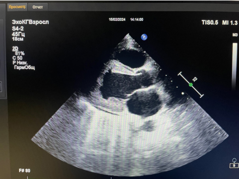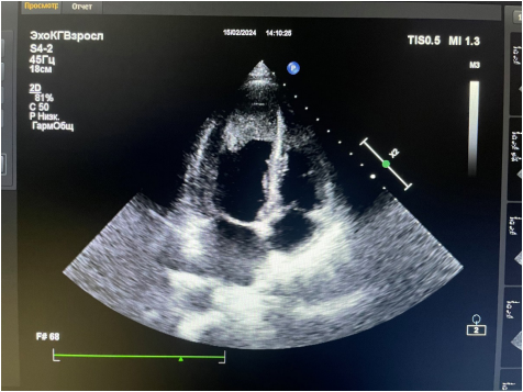 Рис. 1. Фото трансторакальной ЭхоКГ от 15.02.2024. Апикальная позиция.