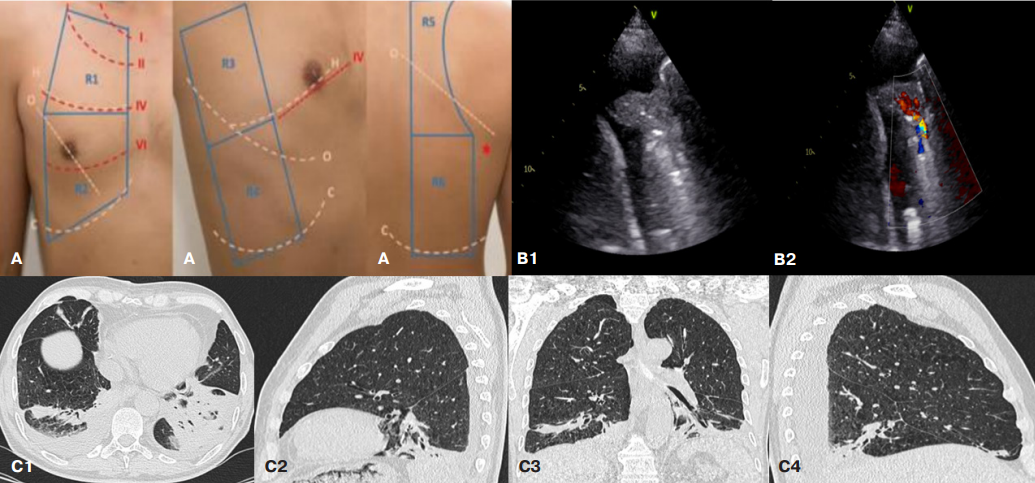 Примечание: А — области ультразвукового сканирования лёгких с использованием 6-точечного протокола, В — УЗИ (В1 — правая задняя нижняя зона, В-режим, В2 — правая задняя нижняя зона, режим ЦДК), С — спиральная КТ ОГК (С1 — аксиальная проекция в легочном окне на уровне базальных сегментов, С2 — сагиттальная проекция в легочном окне левого легкого, С3 — коронарная проекция в легочном окне, С4 — сагиттальная проекция в легочном окне правого лёгкого).