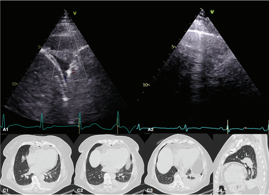 Примечание: А — УЗИ (А1 — правая задняя нижняя зона, В-режим, А2 — правая задняя нижняя зона, режим ЦДК), С — спиральная КТ ОГК (С1, С2, С3 — аксиальные проекции в легочном окне на уровне базальных сегментов, С4 — сагиттальная проекция в легочном окне левого легкого).