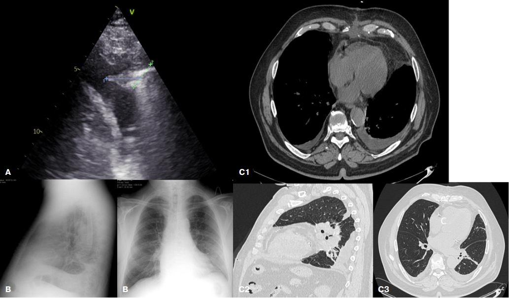 Примечание: А — УЗИ (правая задняя нижняя зона, В-режим), В — рентгенография, С — спиральная КТ ОГК (С1 — аксиальная проекция в средостенном окне на уровне мечевидного отростка грудины, С2 — сагиттальная проекция в легочном окне на уровне базальных сегментов левого лёгкого, С3 — аксиальная проекция в легочном окне на уровне левого предсердия).