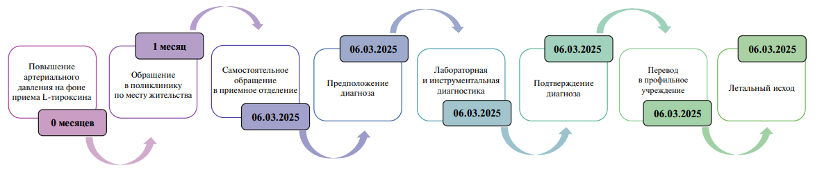 В представленном нами случае РА развилось на фоне эпизодической АГ, что подтверждает повышенную уязвимость сосудистой стенки при сШ-Т даже при транзиторном повышении АД. Клиническая картина отличалась атипичностью: доминировали неспецифические симптомы, что симулировало проявления нейроциркуляторной дистонии и психогенного расстройства. Подобные диагностические трудности признаны значимым фактором отсроченной диагностики РА [26]. Особый патогенетический интерес представляет назначение заместительной терапии L-тироксином незадолго до манифестации РА. Учитывая, что тиреоидные гормоны обладают положительным хроно- и инотропным эффектом, повышают чувствительность рецепторов к катехоламинам и потенцируют симпатическую активность, можно предположить, что даже кратковременная коррекция гипотиреоза на фоне сосудистой дисплазии и врожденных аномалий аорты могла индуцировать гипертензивную реакцию. Последняя, в свою очередь, могла выступить триггерным фактором РА [27-30]. Предполагаемый механизм тироксин-опосредованной гемодинамической нагрузки на морфологически измененное сосудистое русло требует дальнейшего изучения, но имеет патофизиологическое обоснование.