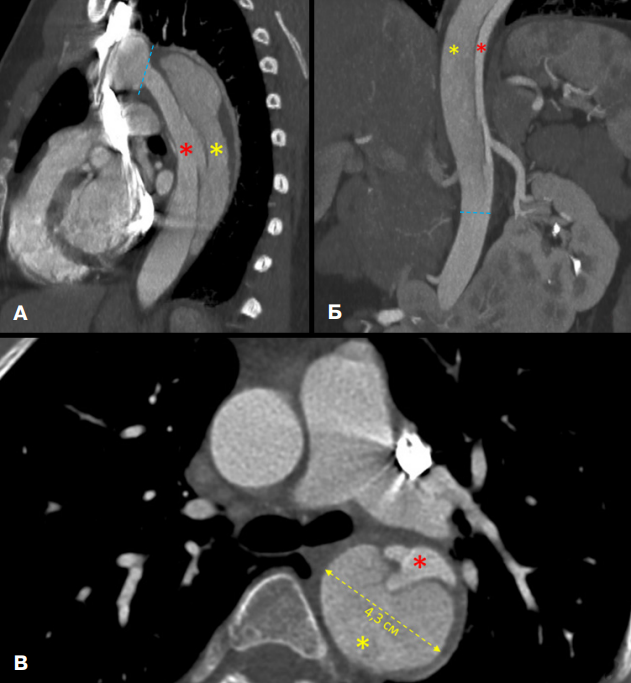 Примечание: А — сагиттальная плоскость, Б — фронтальная плоскость, В — аксиальная плоскость. Проксимальная граница расслоения расположена непосредственно после отхождения левой подключичной артерии от дуги аорты, дистальная граница — на уровне инфраренального отдела брюшного отдела аорты (голубые пунктирные линии). Ложный просвет (желтая звезда) имеет больший размер, чем истинный просвет (красная звезда), наибольший диаметр аорты на уровне нисходящей части — 4,3 см. Четко визуализируется только дистальный разрыв интимы в области дистальной границы. Цветное изображение доступно в электронной версии журнала.