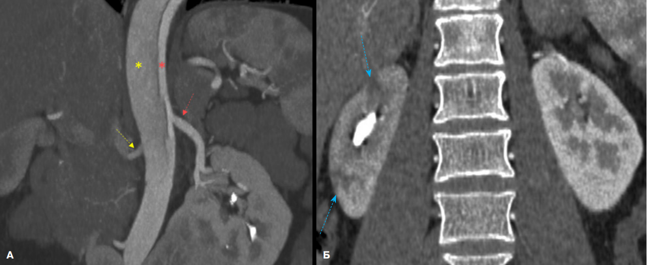 Примечание: А — фронтальная плоскость (на уровне отхождения почечных артерий), Б — фронтальная плоскость (на уровне почек). Правая почечная артерия (желтая стрелка) отходит из ложного просвета, в отличии от левой почечной артерии (красная стрелка). Имеются различия общей перфузии паренхимы почек за счёт снижения контрастирования правой почки с формированием инфарктов (синие стрелки), а также слияние нижних полюсов почек (подковообразная почка). Цветное изображение доступно в электронной версии журнала.