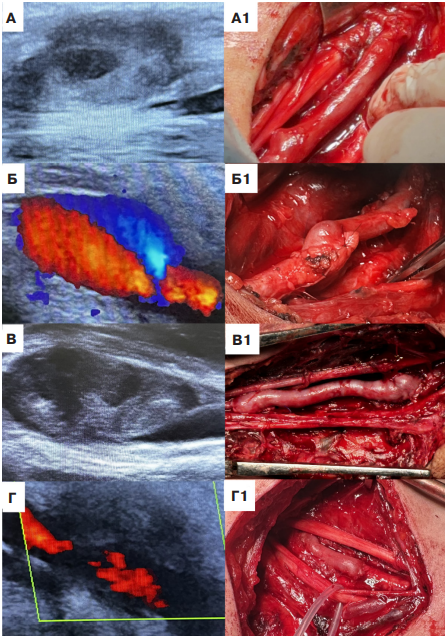 Примечание: А, Б, В, Г — снимки УЗИ подмышечной псевдоаневризмы 1, 2, 3, 4 пациентов до операции, соответственно; А1, Б1, В1, Г1 — удаление псевдоаневризмы с аутовенозным протезированием подмышечной артерии у 1, 2, 3, 4 пациентов, соответственно.