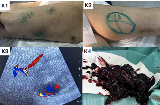 Примечание: К1 — раны латеральной поверхности бедра в стадии рубцевания; К2 — проекция псевдоаневризмы; К3 — ультразвуковой снимок псевдоаневризмы глубокой бедренной артерии; К4 — удаленные тромботические массы из полости аневризмы.