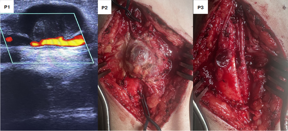 Примечание: Р1 — ультразвуковой снимок псевдоаневризмы; Р2 — псевдоаневризма лучевой артерии после выделения; Р3 — реконструкция лучевой артерии анастомозом "конец-в-конец".