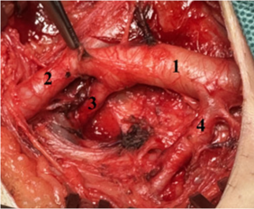 Интраоперационно выделены артерии в паховой области. При этом во время ревизии обнаружена "находка" — крупная дополнительная артериальная ветвь, отходящая от общей бедренной артерии, идущая на латеральную поверхность бедра. Данная особенность не влияла на ход операции (рис. 5).