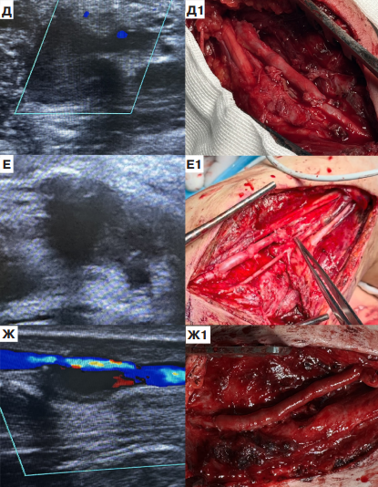 Примечание: Д, Е, Ж — снимки УЗИ плечевой псевдоаневризмы 1, 2, 3 пациентов до операции, соответственно; Д1, Е1, Ж1 — удаление псевдоаневризмы с аутовенозным протезированием плечевой артерии у 1, 2, 3 пациентов, соответственно.