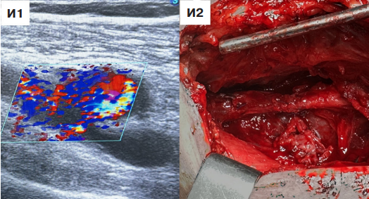 Примечание: И1 — ультразвуковой снимок псевдоаневризмы подколенной артерии; И2 — подколенная вена после реконструкции аутовенозной заплатой.