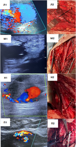 Примечание: Л1, М1 — УЗИ пациентов с псевдоаневризмой поверхностной бедренной артерии; Л2, М2 — поверхностная бедренная артерия после реконструкции "конец-в-конец"; Н1, П1 — УЗИ пациентов с псевдоаневризмой задней большеберцовой артерии; Н2, П2 — задняя большеберцовая артерия после реконструкции "конец-в-конец". 1 — анастомоз поверхностной бедренной артерии "конец-в-конец"; 2 — анастомоз поверхностной бедренной артерии "конец-в-конец"; 3 — анастомоз задней большеберцовой артерии "конец-в-конец"; 4 — анастомоз задней большеберцовой артерии "конец-в-конец".