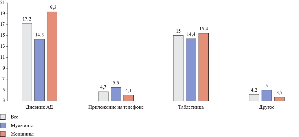 Заполнялась анкета по демографическим и антропометрическим данным, о навыках самоконтроля АД, особенностях приема АГТ и сопутствующей терапии (статины, антиагреганты). Собиралась информация относительно сопутствующей патологии: сахарного диабета (СД), инфаркта миокарда (ИМ), инсульта (без уточнения типа) в анамнезе. Также задавались вопросы о поведенческих факторах: курении обычных и электронных сигарет, а также потреблении соли (ограничивает ли пациент). Анкета заполнялась самостоятельно пациентом или врачом со слов пациента.