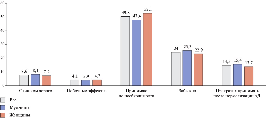 Результаты. В анализ данных были включены 7972 респондента от 18 до 96 лет (медиана возраста 62 года [51;71]), из них 3372 мужчины (42,3%). Среди участников прием АГТ выявлен в 74,4% случаев и достижение целевого АД — в 62,6% случаев по критерию целевого АД <140/90 мм рт.ст. и 25,8% — в слу чае АД <130/80 мм рт.ст. "Прием препаратов по необходимости" остается ли дирующей причиной отсутствия приема АГТ среди пациентов с АГ. Примерно половина участников (57,7%) ответили, что не используют системы напоми нания о приеме препаратов, чаще всего пациенты с АГ используют дневни ки самоконтроля АД и таблетницы. У каждого пятого пациента с АГ была за регистрирована АГТ в виде монотерапии, у каждого третьего в виде двойной АГТ и у каждого четвертого — тройной АГТ. Фиксированные комбинации при нимали 34,5% пациентов. В амбулаторной практике лечения пациентов с АГ выявлены гендерные различия: значимо более высокая распространенность приема АГТ, использования систем напоминания о приеме АГТ, обсуждения с врачом, эффективность лечения и контроля АГ у пациентов женского пола. Обсуждение врачом важности соблюдения рекомендаций ассоциировалось со значимо более высоким достижением целевого уровня АД (отношение шансов (ОШ) 1,43), использованием фиксированной комбинации АГТ (ОШ 1,3) и нали чием статинотерапии (ОШ 1,39), p<0,0001.