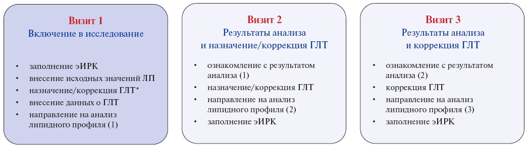 Дизайн исследования (структура визитов) представлен на рисунке 1. Структура визитов соответствует современным клиническим рекомендациям по нарушениям липидного обмена. При этом необходимо отметить, что кратность исследований ХС ЛНП превышает нормативный показатель, установленный Приказом Минздрава России 15.03.2022 № 168н "Об утверждении порядка проведения диспансерного наблюдения за взрослыми" "не реже 1 раз в год".