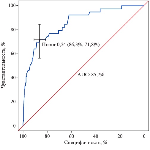 Рис. 1. Чувствительность, специфичность и порог многофакторной предиктивной модели АГ.