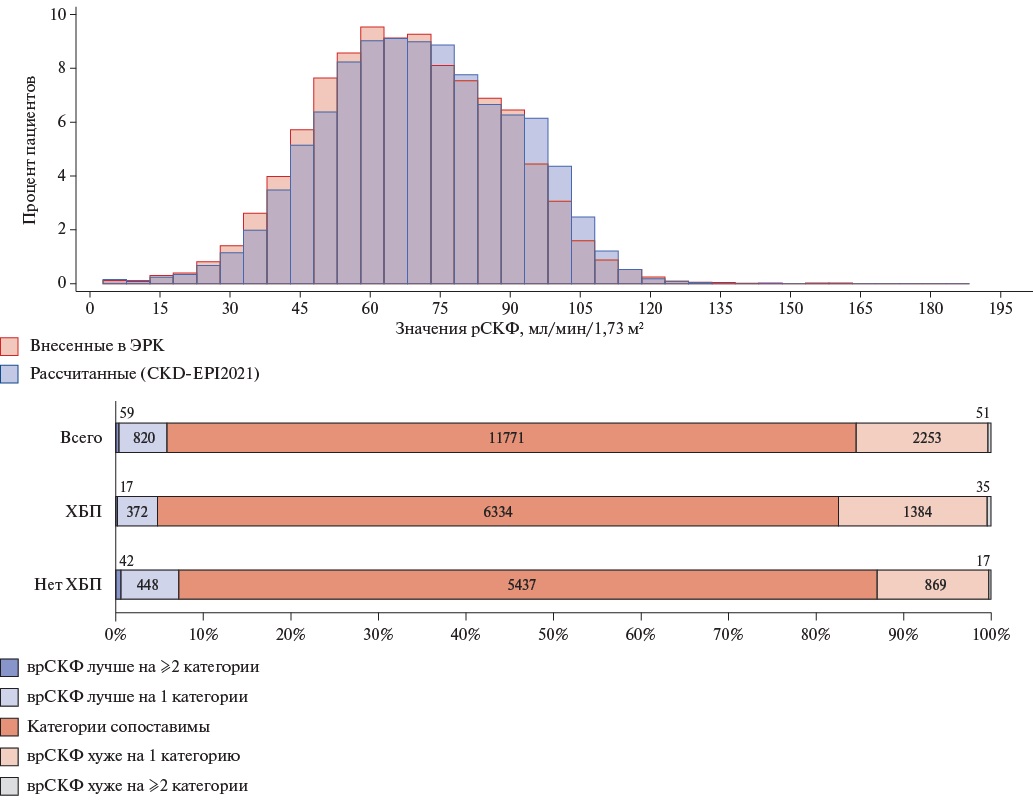 Сокращения: врСКФ — внесённая в электронную регистрационную форму расчётная скорость клубочковой фильтрации, рСКФ — расчётная скорость клубочковой фильтрации, ХБП — хроническая болезнь почек, ЭРК — электронная регистрационная карта.