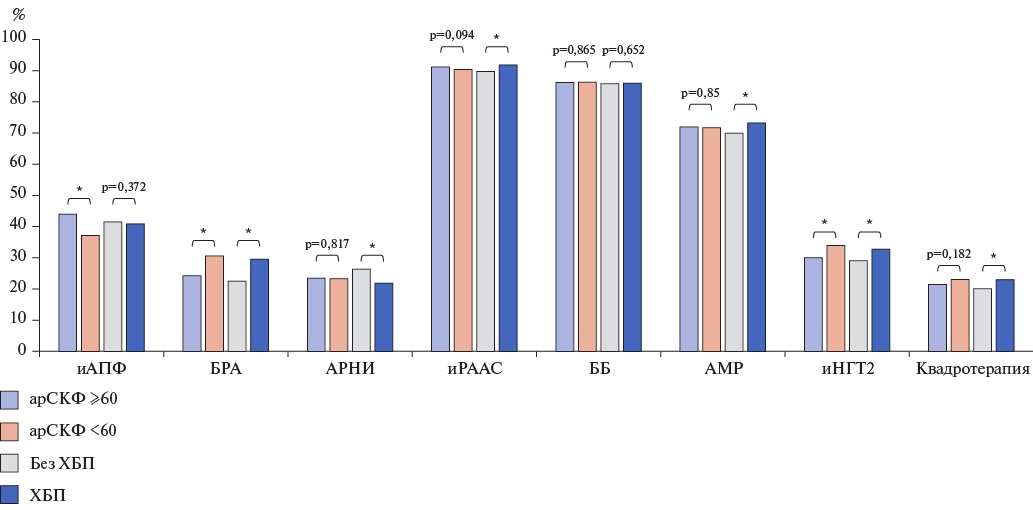 По данным регистра Swedish HF, доля пациентов с назначением иАПФ, БРА, АМР, АРНИ снижалась по мере снижения рСКФ, такая закономерность не выявлена в отношении ББ [22]. В данном субанализе для иАПФ, АМР, иНГТ2 наблюдалось аналогичное снижение назначения по мере ухудшения почечной функции, для ББ и АРНИ не отмечено значимых изменений, а для БРА выявлено увеличение доли пациентов с их назначением.